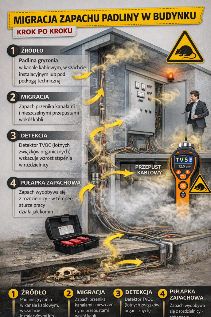 Nieprzyjemny zapach rozkładu organicznego („zapach padliny”) to problem, który regularnie pojawia się w budynkach biurowych, przemysłowych i mieszkalnych. Bardzo często użytkownicy lokalizują go w pobliżu rozdzielnic elektrycznych, szaf teletechnicznych lub pomieszczeń technicznych, co naturalnie budzi obawy o awarię instalacji, przegrzewanie urządzeń albo zagrożenie pożarowe.
