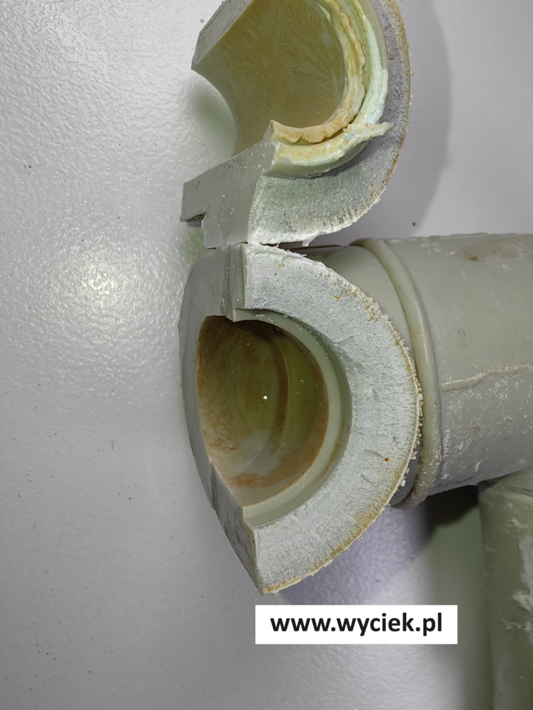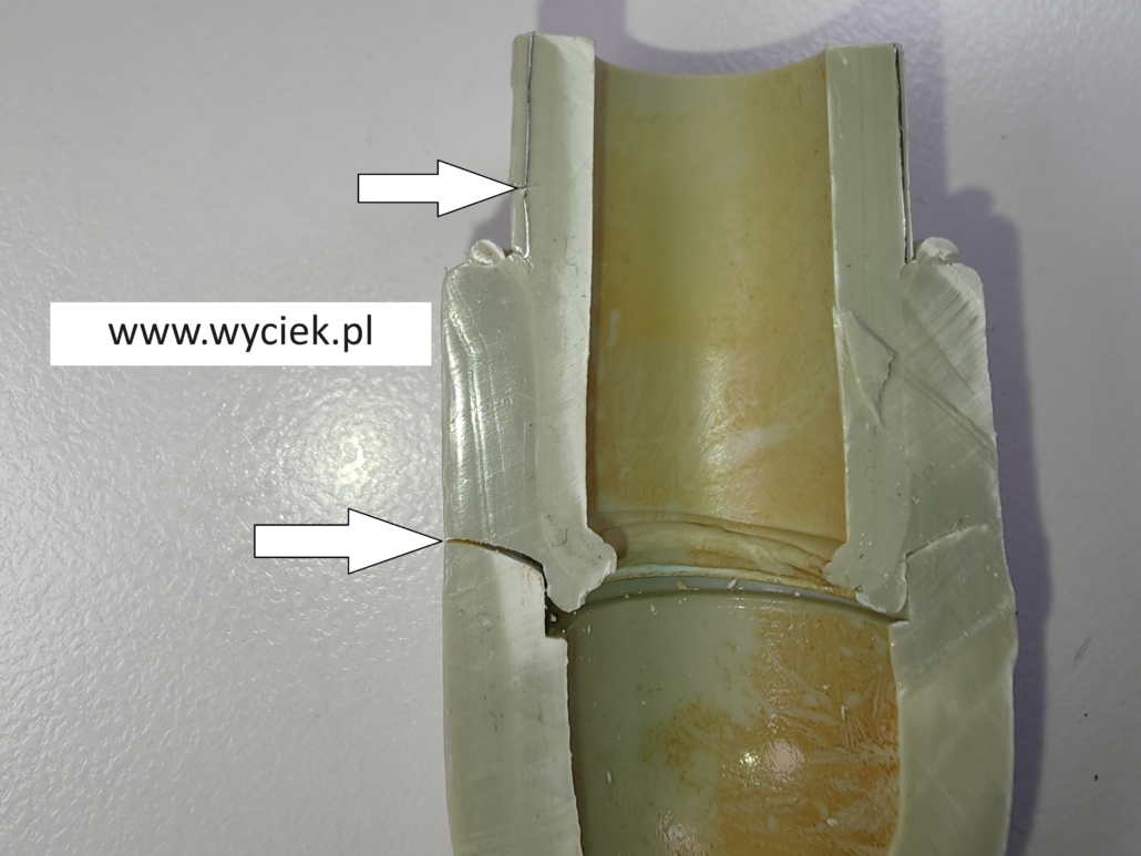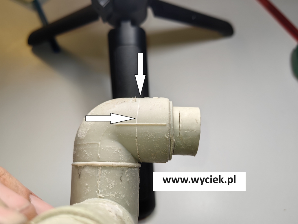 Wyciek spowodowany został przez uszkodzenia kolana rury PP w najcieńszym miejscu, czyli na krawędzi strefy zgrzewu kolana