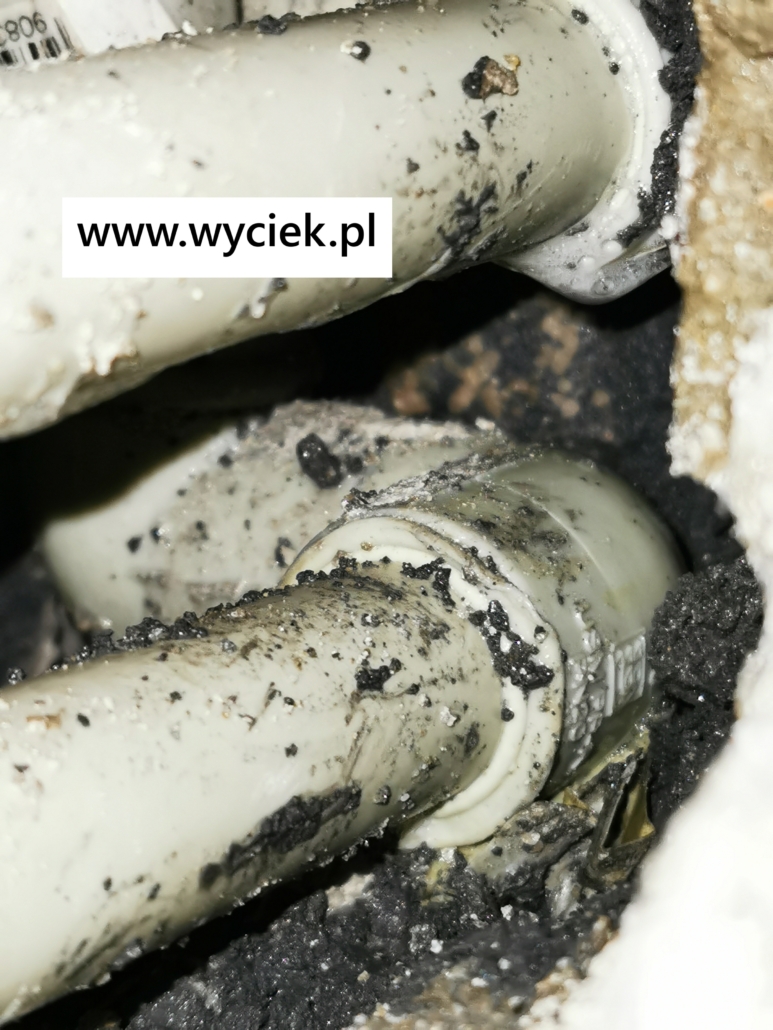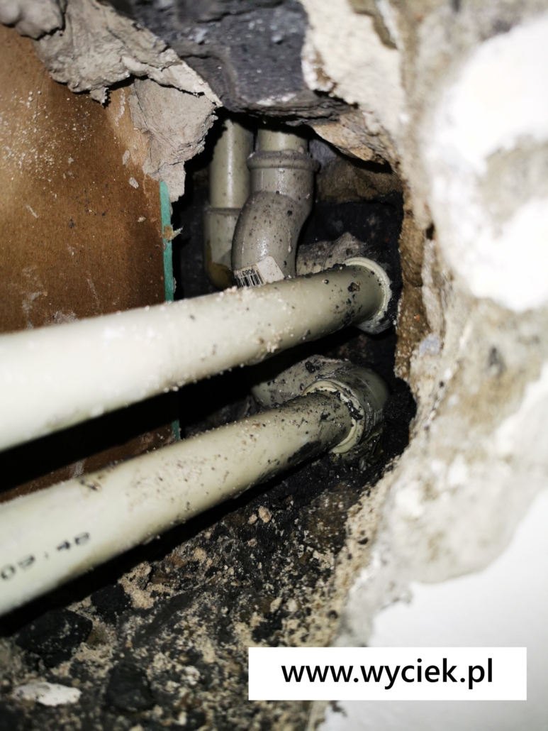 W celu weryfikacji miejsca wycieku wykonaliśmy niewielkie odkucie próbne. Nasza diagnoza potwierdziła się – woda wyciekała z powodu błędu w połączeniu rurek PP.