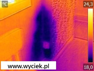 W przypadku wycieku wody, chłodna woda przesiąkająca przez ścianę lub podłogę powoduje obniżenie temperatury w danym miejscu. Kamera termowizyjna natychmiast wychwytuje tę anomalię, prezentując ją w postaci wyraźnej, chłodniejszej plamy (najczęściej w odcieniach fioletu lub błękitu) na ciepłym tle (czerwień, pomarańcz, żółć). Dzięki temu możliwe jest dokładne zidentyfikowanie miejsca nieszczelności, bez konieczności niszczenia całej ściany.