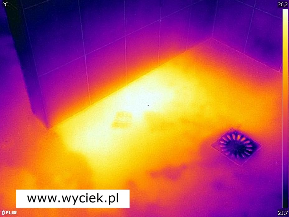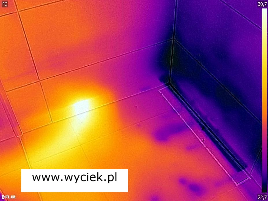 Termowizyjne wykrywanie wycieku wody w strefie prysznica – nagromadzenie wilgoci w okolicy odpływu widoczne na obrazie termicznym
