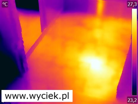 Lokalizacja wycieku wody kamerą termowizyjną – widoczna anomalia temperaturowa na podłodze wskazująca na nieszczelność instalacji.