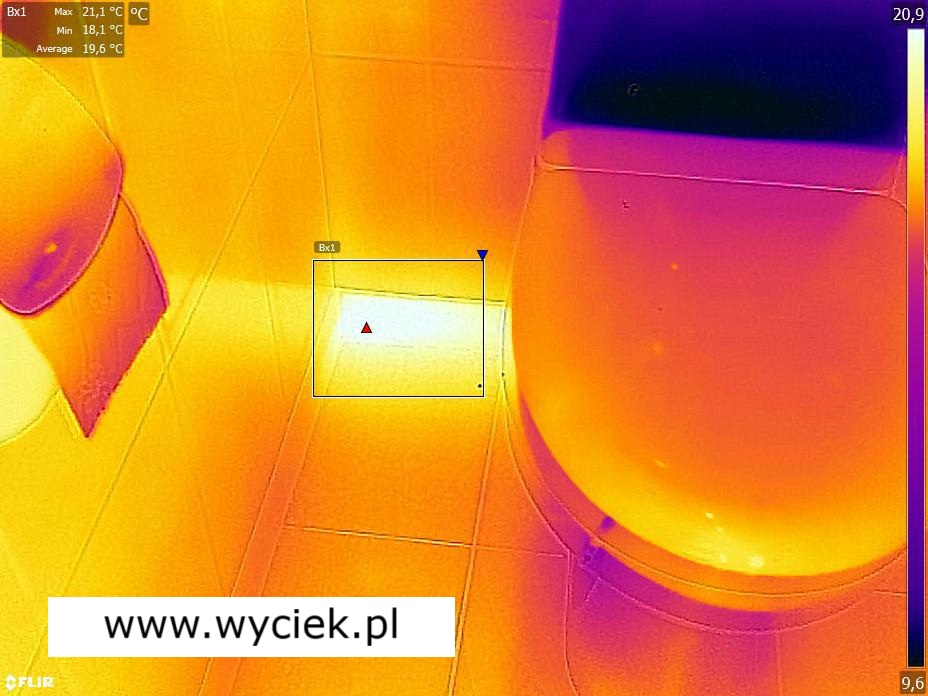 Wykrywanie wycieku wody pod posadzką w łazience – różnice temperatur przy toalecie wskazujące na zawilgocenie instalacji.