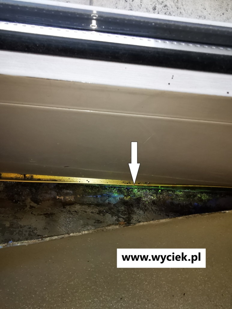 - Próby szczelnościami barwnikami. Barwiniki to prosta, ale skuteczna metoda lokalizacji przecieków z balkonów, tarasów i elewacji. Do wody dodajemy specjalny, intensywnie barwiący preparat, który jest widoczny świetle ultrafioletowym. Miejsca, w których pojawia się zabarwiona woda, wskazują na nieszczelności. Metoda ta jest szczególnie przydatna do lokalizacji przecieków w miejscach, gdzie woda może swobodnie penetrować np. przez zniszczone fugi, pęknięcia w tynku czy uszkodzone obróbki blacharskie?