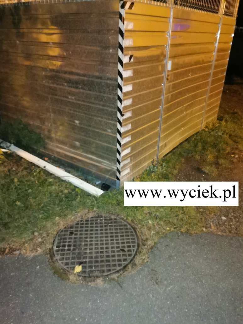 Wiata śmietnikowa. Woda z nieszczelnej instalacji wpływała do studzienki widocznej na zdjęciu.