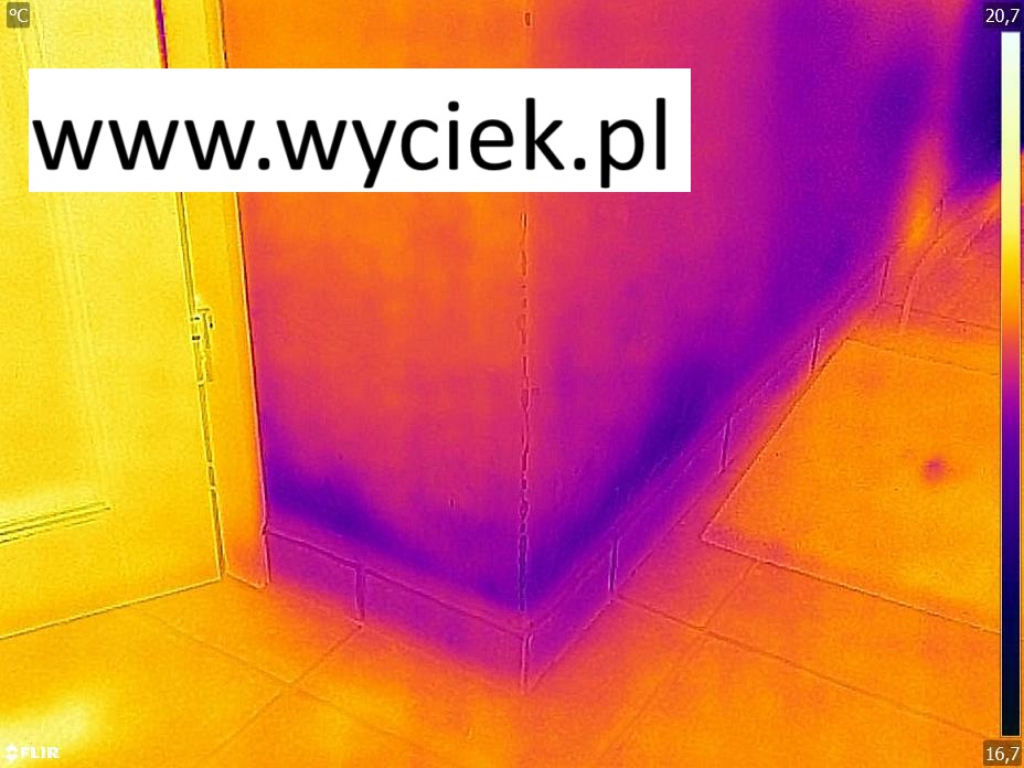 Zlecenie jak wiele innych. Mokre ściany łazienki w budynku jednorodzinnym. Zgłoszenie szkody do ubezpieczyciela, zgoda na firmę do lokalizacji wycieków wody. Nie mogę napisać wszystkiego, ponieważ ten blog to nie kurs lokalizacji, ale sam wygląd ścian pokierował mnie w stronę odpływu brodzika. Poniżej zdjęcie termowizyjne jak wyglądały ściany w podczerwieni.